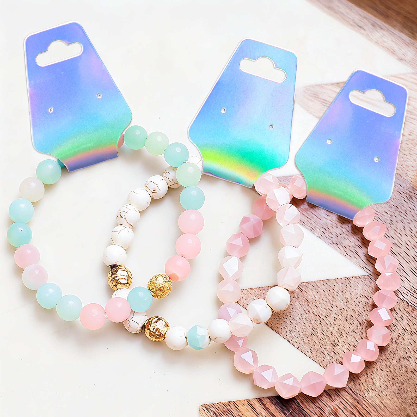 [Premium Holographic Jewelry Cards] – Bracelet display card is crafted from 300gsm cardstock, designed with a holographic finish that adds a professional shine to jewelry display. The reflective surface ensures your jewelry tags stand out at craft fairs or boutique showcases.