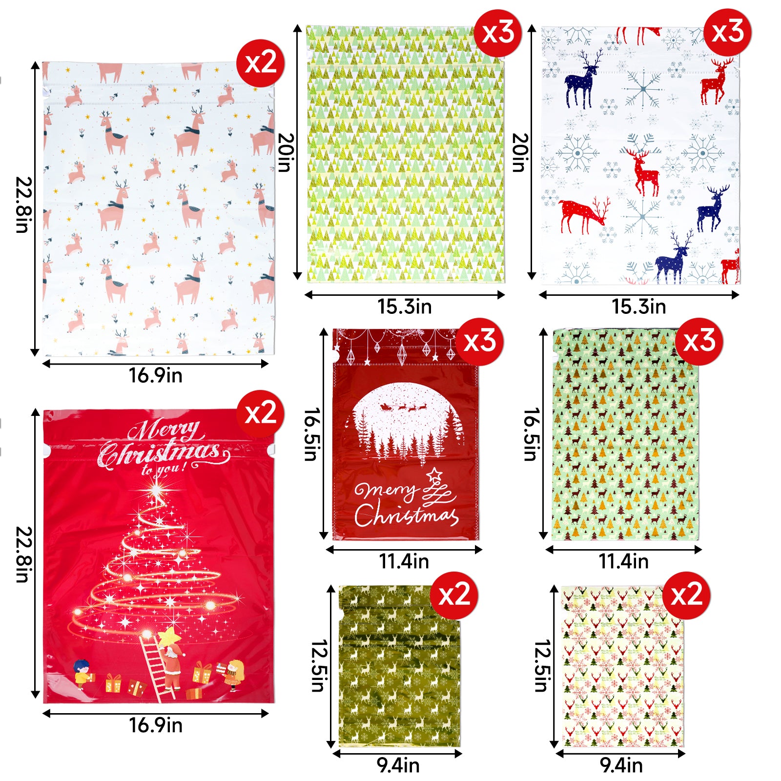 20Pcs Holiday Gift Bags - This package includes 20 Christmas drawstring gift bags, featuring 8 Christmas-themed patterns and 4 different sizes to suit your preferences and packaging needs. Extra-large (4 pieces): 22.8 x 16.9 inches, Large (6 pieces): 20 x 15 inches, Medium (6 pieces): 16.5 x 11.4 inches, Small (4 pieces): 12.5 x 9.4 inches.