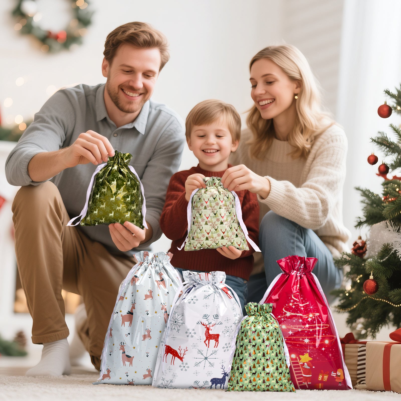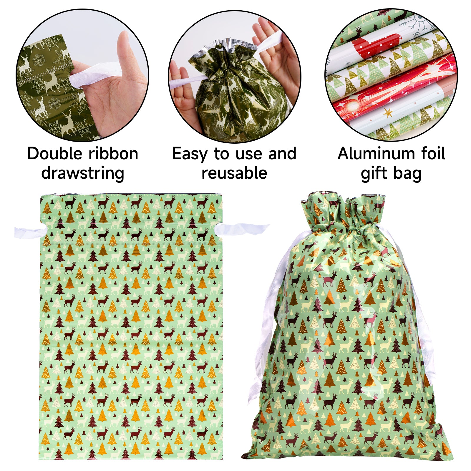 Multi-Purpose Drawstring Present Bags - These foil Christmas bags can be used to hold books, clothing, toys, dolls, candy, cookies, DIY craft, snacks, cosmetics, stationery, wine, giant Christmas gifts, and other Christmas gifts. Fill each gift with a rich Christmas atmosphere and enhance the anticipation and joy of giving and receiving. They can also be used for birthdays, baby showers, winter weddings, prayer service, Thanksgiving, Christmas, New Year's parties, and home storage.