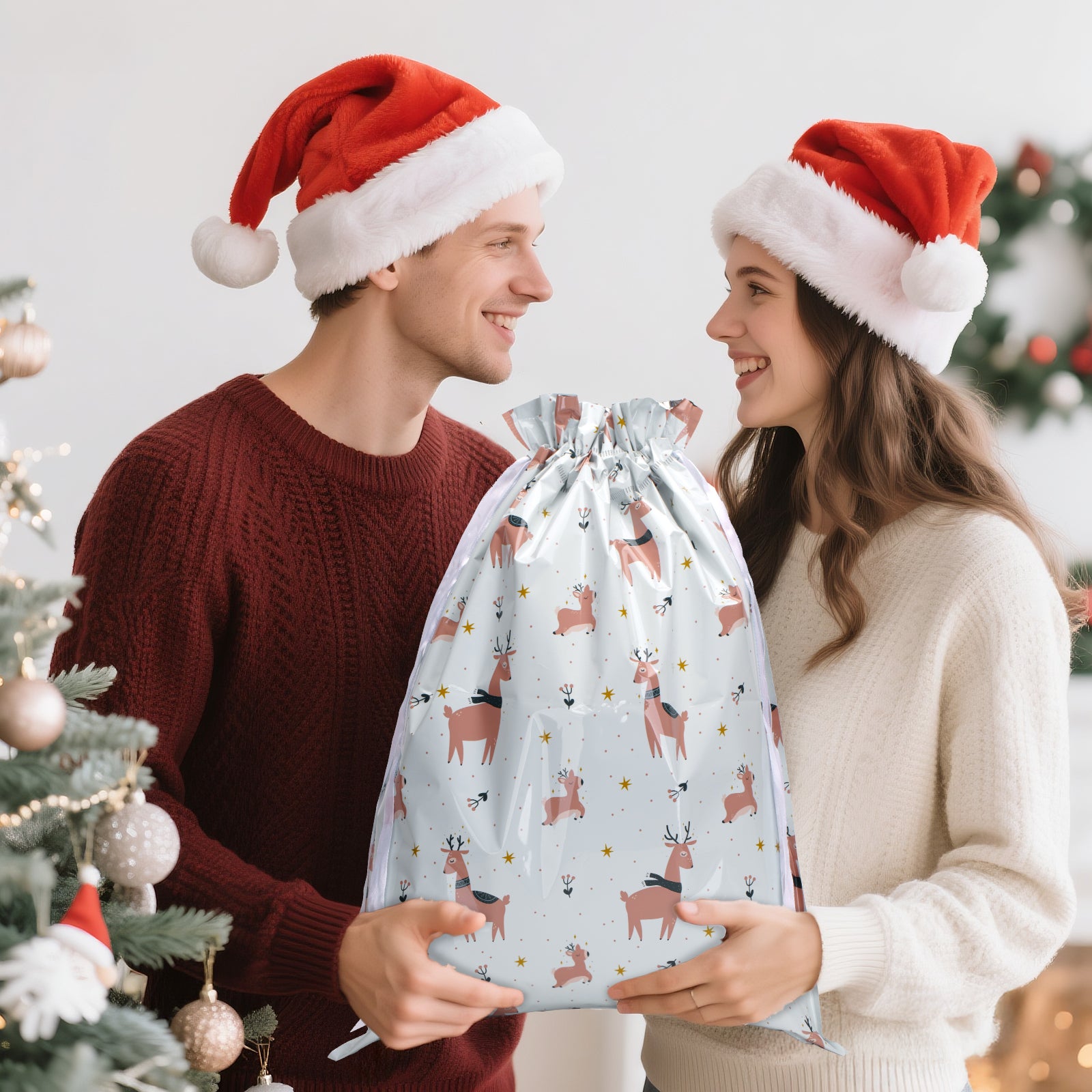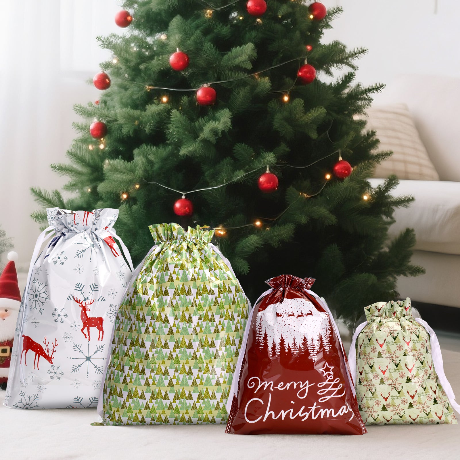 Drawstring Closure Christmas Bag - Holiday foil gift bags are very easy to use, have a large capacity, and can be used to wrap various sizes of holiday gifts. Double drawstring design, one pull on both ends to tighten it, quick and easy to use. Sturdy holiday gift wrapping bags can wrap odd-shaped items, and the sharp corners won't easily cause the gift bags to break.