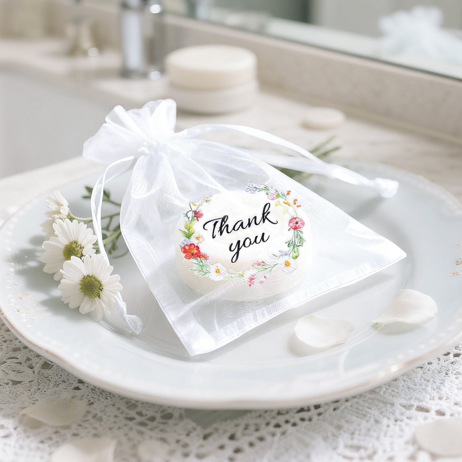 Floral Thank You Organza Bag - This organza party favor bag features a white base with a watercolor-style floral and green leaf print and the words “Thank You” printed in the center. The pattern and text are printed and won't fade, creating a warm and sincere atmosphere. These thank you organza bags not only enhance the beauty of the gift but also convey gratitude and heartfelt sentiments, making each gift even more special.