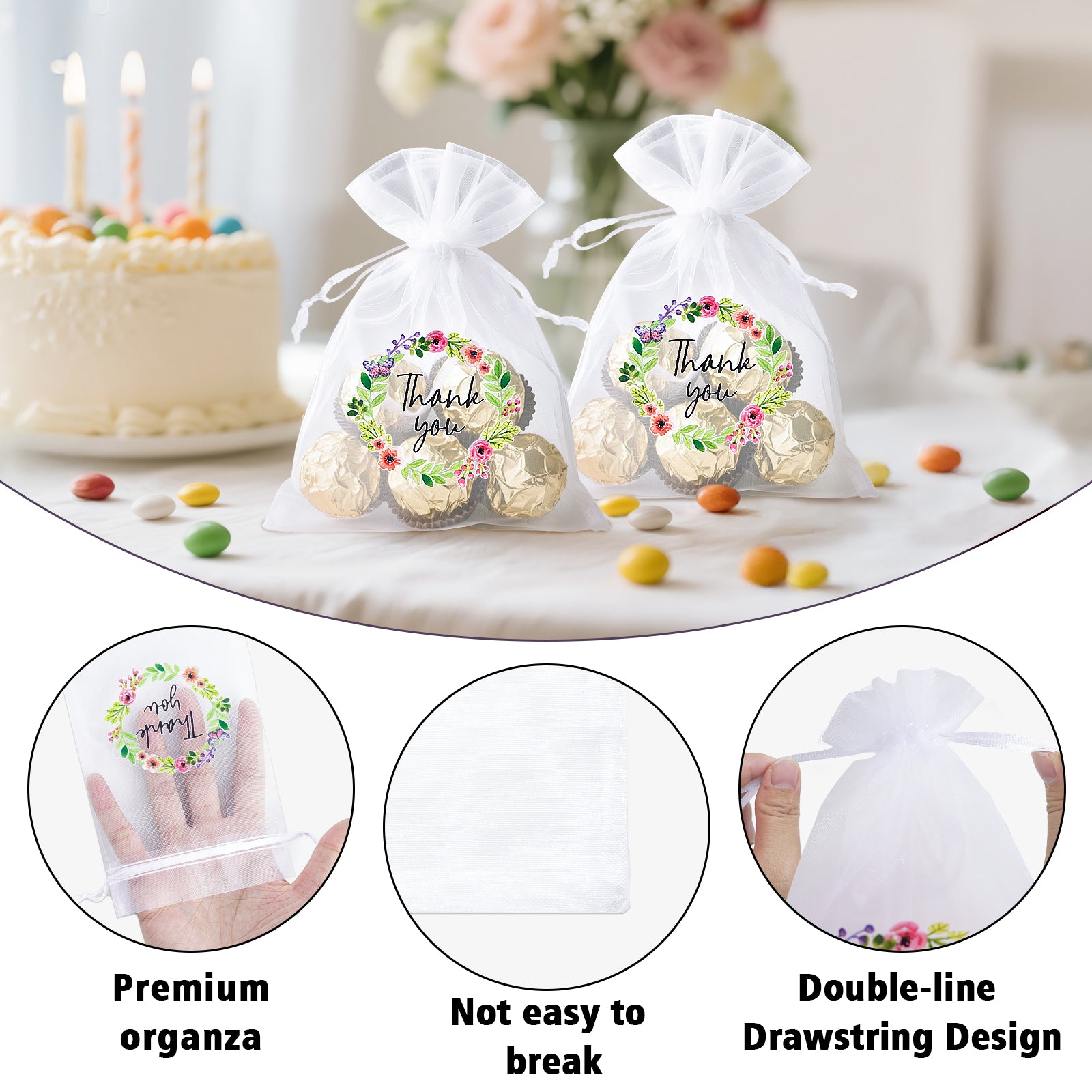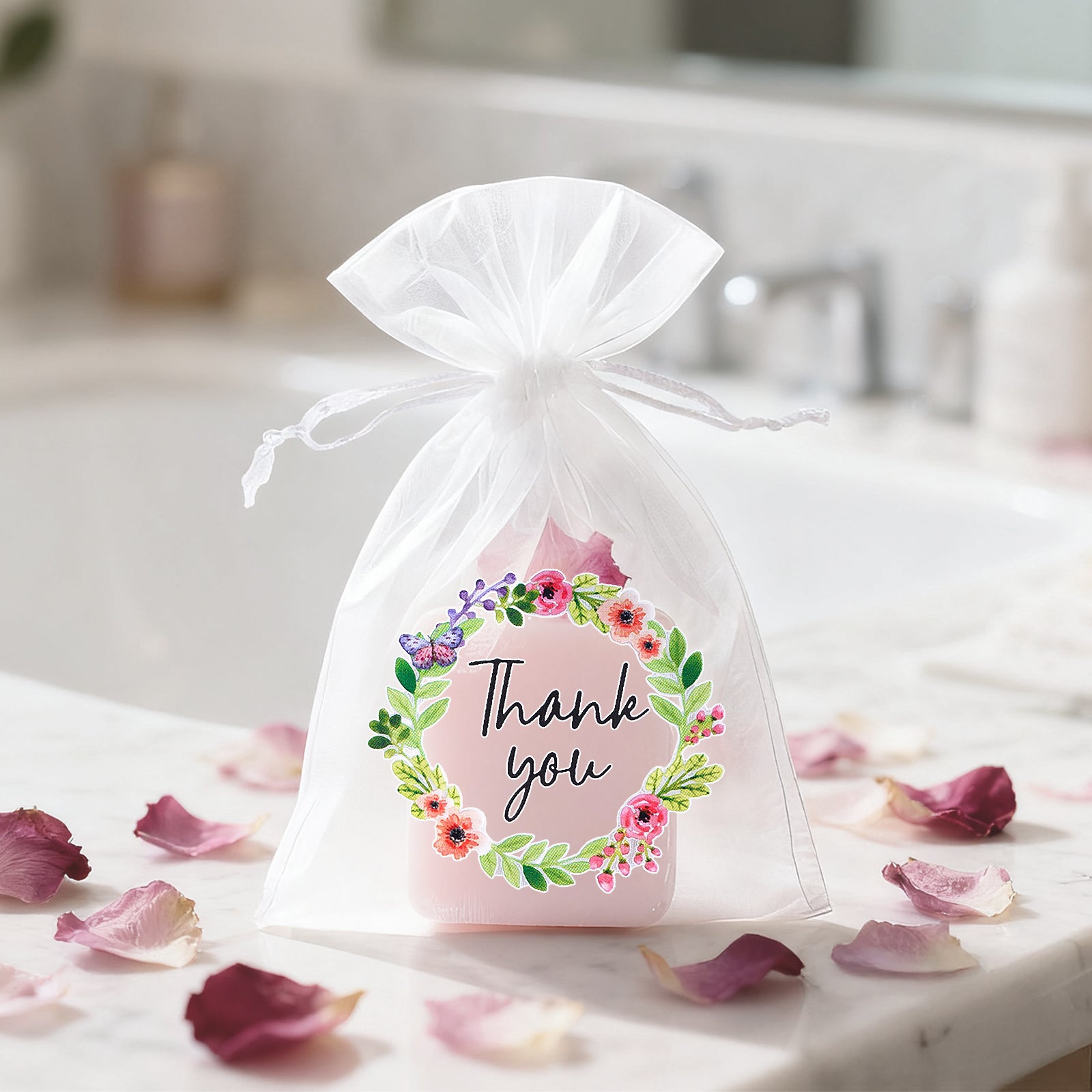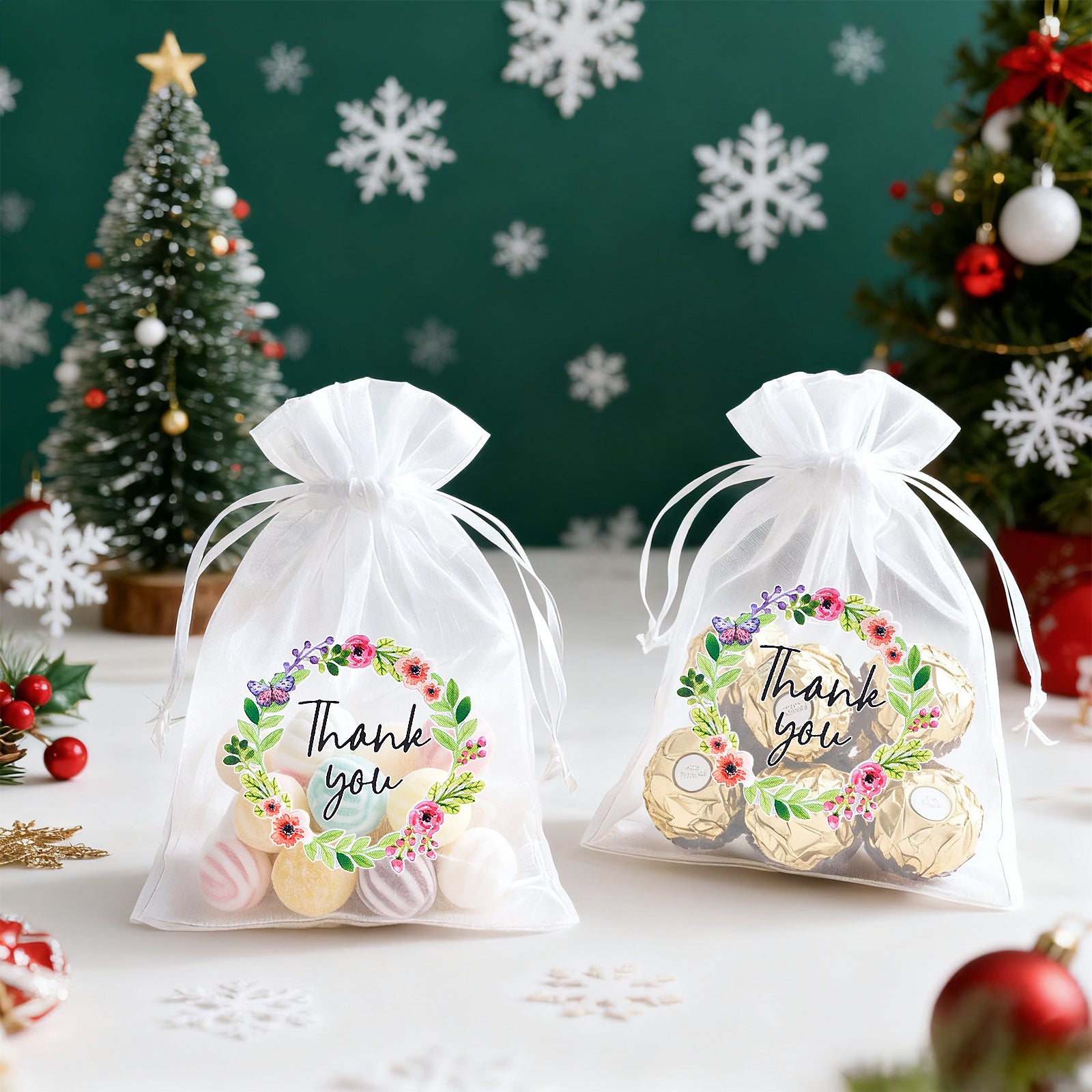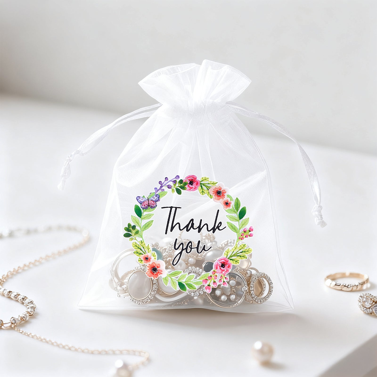 Flower Thank You Organza Bag - This organza party favor bag is white with the words “Thank You” printed in the center, surrounded by watercolor-style flowers and green leaves. The text and patterns are clearly printed and won't fade, creating a warm and sincere atmosphere. These elegant thank you organza bags not only enhance the beauty of the gift, but also convey gratitude and heartfelt sentiments, making each gift even more special.